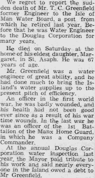 His medical condition was not good as a result of the injury, and his doctors eventually recommended that he live in a less polluted environment. So in 1930 after making several unsuccessful applications for posts, including the Senior Waterworks Engineer post at Barnsley and a Scottish vacancy in Perth (Dundee Courier – Friday 23 March 1928 P12 col 3), he and Edith moved to the clear air of the Isle of Man where on 14 November 1930 Douglas Corporation Water Committee (after some heated discussion as to whether the post of Water Engineer was needed at all) appointed from the 43 applicants, Mr Thos. Challen Greenfield, B.Sc., M.I.C.E., A.M.Inst.W.E., deputy Water Engineer to Barnsley Corporation, to be Water Engineer for Douglas, in succession to Mr Alan Boothman, A.M.I.C.E., at a salary of £400 a year rising to £550 after 7 years (£26,342 to £37,747 at 2019 prices). He served there for 29 years, and though, through his injury, not a fit man, as Captain T.C. Greenfield, he took part as Company Commander of the Manx Home Guard in the Second World War (Isle of Man Times, Saturday, August 01, 1942; Page: 5 and Mona’s Herald, Tuesday, March 24, 1959; Page: 5).