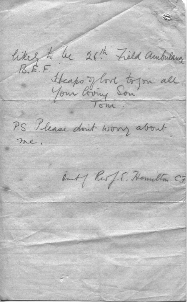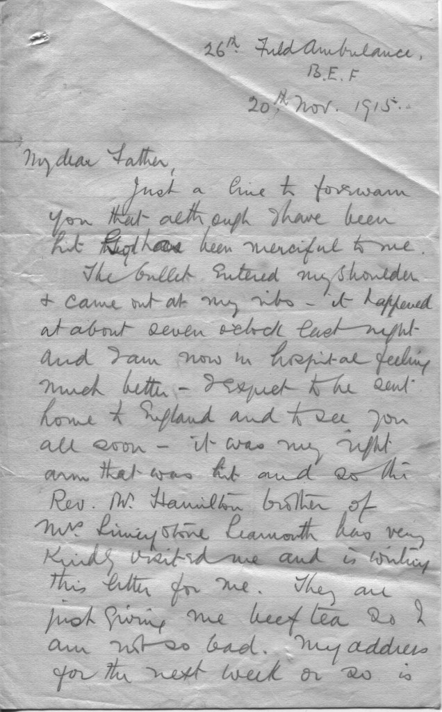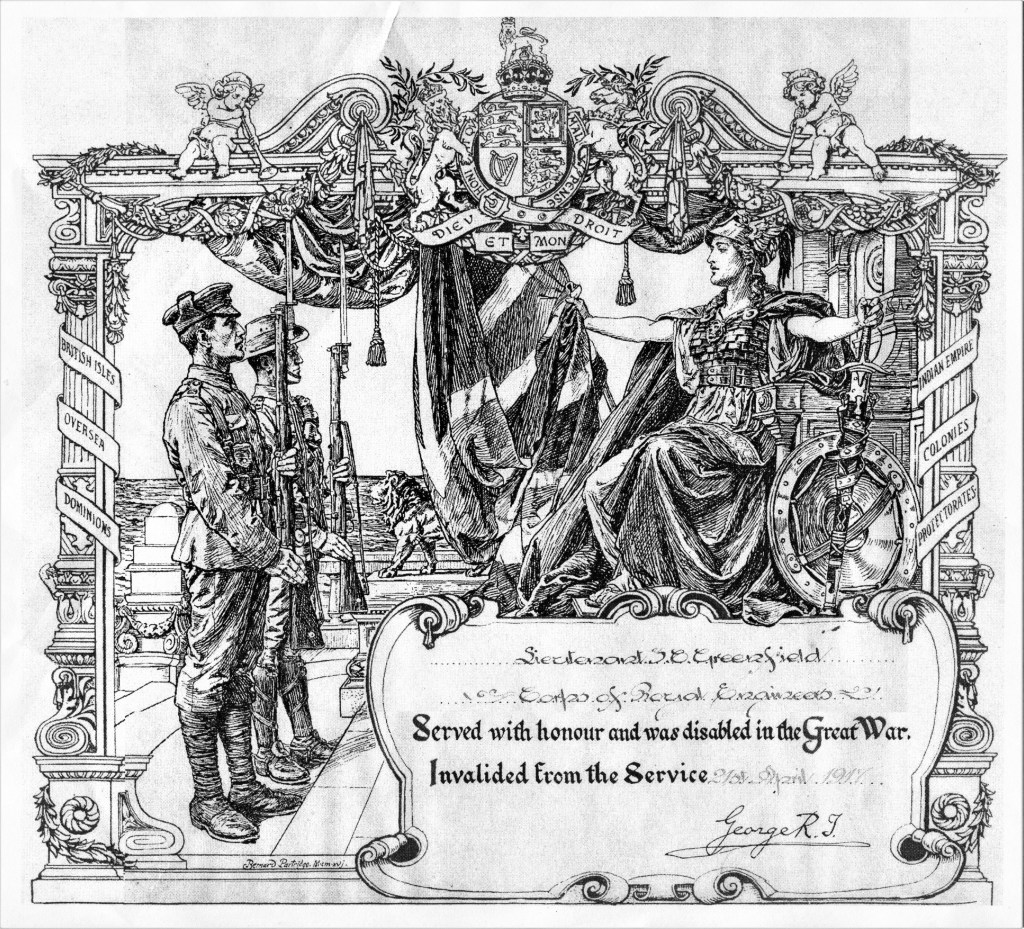 As a 21 year old Lieutenant in the Corps of Royal Engineers Regiment on 19 November 1915, he was badly wounded in the shoulder and lung. Initially treated and operated on at the 26th Field Ambulance (history), and then transported by river barge from Bac St Maur over several stressful days at Christmas 1915 to “Officers Hospital, No 10 Stationary, B.E.F.” at St Omer. Then eventually by train to Duchess of Westminster’s (No.1 Red Cross) Hospital at Le Touquet (Le Touquet-Paris-Plage). He was in hospital in France for two months waiting for his condition to improve sufficiently to allow a safe passage home. His older Brother, Godwin Greenfield (1884-1958), then a doctor working with the Royal Army Medical Corps in France, visited him several times and was able to report back to the family on Tom’s behalf. Later he was repatriated to Sussex Lodge Hospital in Regents Park. He then undertook recuperative treatment in Scotland including a further operation in Summer 1916 at Bangour Hospital. He was eventually invalided out of the service in 1917.